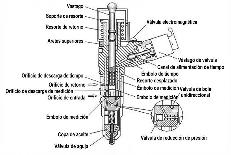 El inyector Cummins consta principalmente de tres partes: el conjunto de la armadura, el conjunto de la válvula de aguja y la cabeza de la tobera. El conjunto de la armadura está compuesto por componentes precisos como la tapa de presión, la electroválvula, el núcleo de la armadura y las calzas. Además, está equipado con un tornillo y resorte de ajuste de la electroválvula.